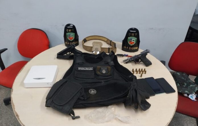 Durante a abordagem policial, foi encontrado no carro dos acusados, um Voyage cinza, diversos itens incriminatórios, incluindo uma pistola .40 da PMAM, um simulacro de pistola, um colete balístico, celulares, e o DVR da residência da vítima, o que corroborou o relato do denunciante.
