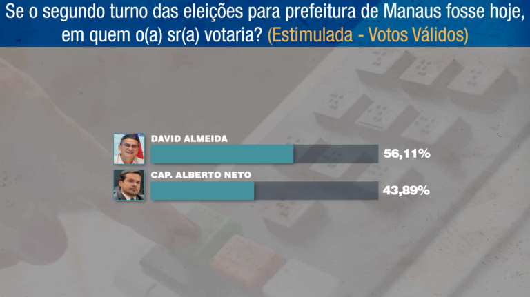Considerando apenas os votos válidos, David Almeida apresenta 56,11% das intenções de voto, contra 43,89% para Cap. Alberto Neto. Esses números revelam um cenário de disputa acirrada, mas com uma clara vantagem para o atual prefeito.