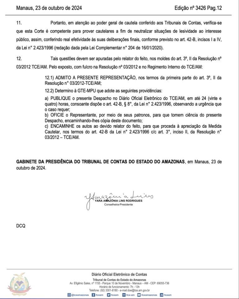A Conselheira-Presidente do TCE-AM, Yara Lins, aceitou a representação e determinou que os autos sejam publicados e notificados dentro de 24 horas, indicando a seriedade da acusação e a necessidade de apuração. A reportagem tentou entrar em contato tanto com o vereador Sassá da Construção quanto com Caio André para obter esclarecimentos sobre a situação. No entanto, até o fechamento desta matéria, não houve retorno de ambos os lados. O espaço permanece aberto para futuras considerações.
