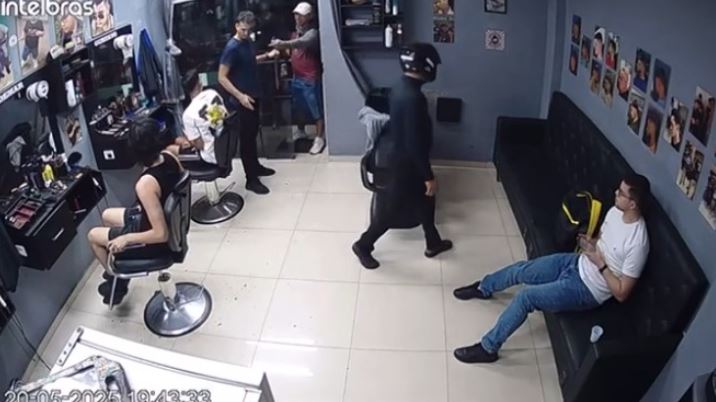 Imagens de câmeras de segurança mostram o suspeito chegando ao local após render um motociclista. Ele obrigou o condutor a acompanhá-lo até a barbearia, fingindo ser apenas mais um cliente.